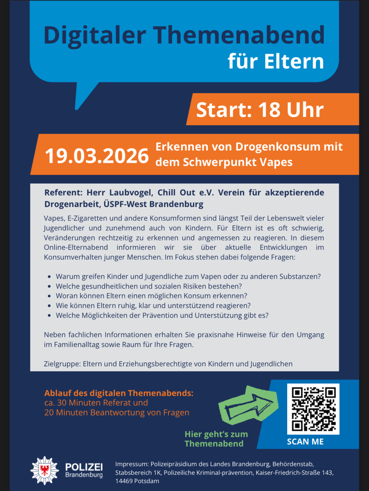 Digitaler Elternabend der Überregionalen Suchtprävention des Landes Brandenburg und der Polizeilichen Prävention des Landes Brandenburg. Lysander wird über das Thema Vapes referieren, das neue Präventions Programm Obstsalat in der Lunge kurz vorstellen und auf die Kontakte in den einzelnen Planregionen hinweisen. Im Anschluss stellen sich Mario Heinemann von der Polizei Prävention und Lysander Laubvogel von Chill Out e.V. den Fragen der Eltern, welche während der Zeit des Referates gesammelt werden. Wir hoffen der akzeptierende Blick und der polizeiliche Blick auf das Thema ermöglicht bereichernde Antworten.